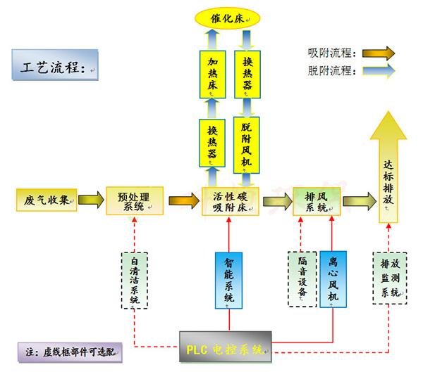 催化燃烧设备根据吸附(效率高)和催化燃烧(节能)两个基本原理设计,采用双气路连续工作,一个催化燃烧室,两个吸附床交替使用。先将有机废气用活性炭吸附,当快达到饱和时停止吸附,然后用热气流将有机物从活性炭上脱附下来使活性炭再生;脱附下来的有机物已被浓缩(浓度较原来提高几十倍)并送往催化燃烧室催化燃烧成二氧化碳及水蒸气排出。当有机废气的浓度达到2000PPm以上时,有机废气在催化床可维持自燃,不用外加热。燃烧后的尾气一部分排入大气,大部分被送往吸附床,用于活性炭再生。这样可满足燃烧和吸附所需的热能,达到节能的目的。再生后的可进入下次吸附;在脱附时,净化操作可用另一个吸附床进行,既适合于连续操作,也适合于间断操作。